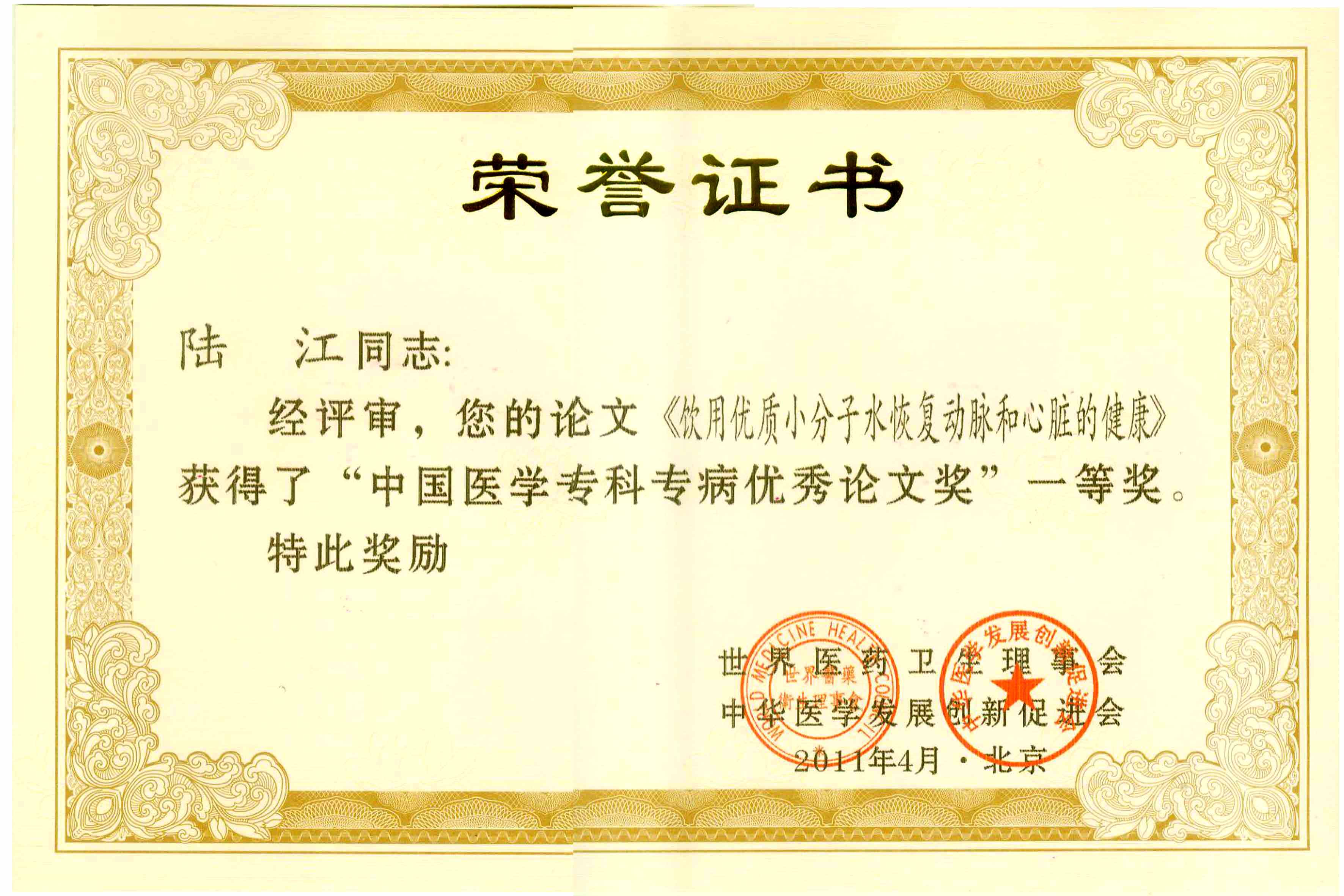 陸江的論文獲一等獎(jiǎng)榮譽(yù)證書-- 陸江論文獲創(chuàng)新論文獎(jiǎng)牌