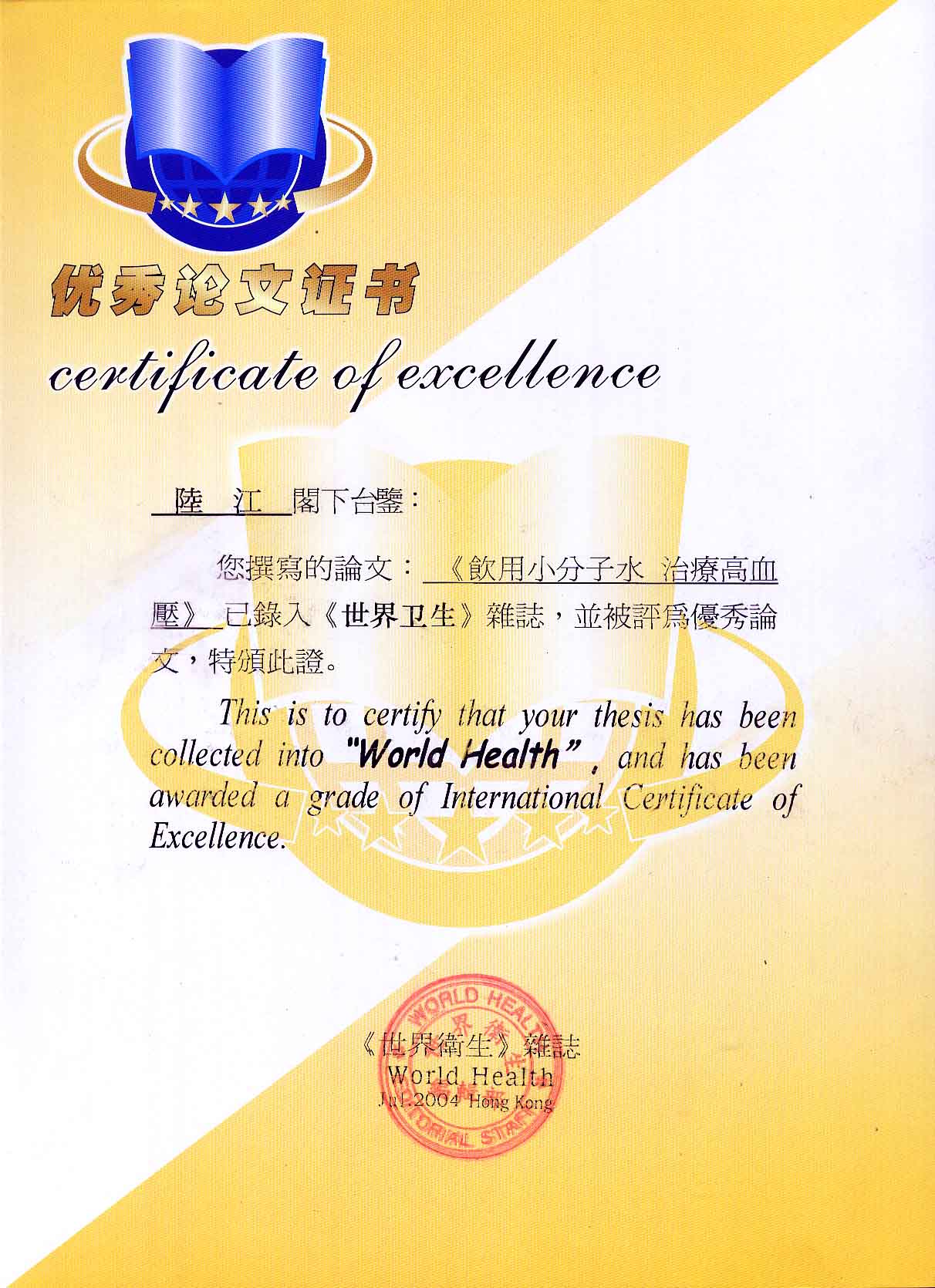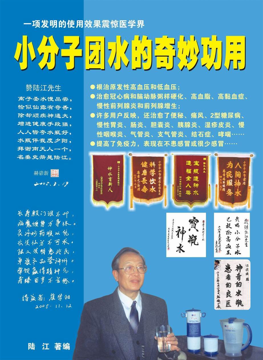 人類幾千年來患以上病癥需終生服藥,幾十年也不能治愈。可是我國(guó)南寧的高級(jí)工程師陸 江,于1990年想根治高血壓,研究發(fā)明了離子水瓶,處理出微小分子團(tuán)水供飲用,經(jīng)過醫(yī)院臨床試用和專家鑒定,1999年獲中國(guó)發(fā)明專利權(quán),產(chǎn)品于2000年投放市場(chǎng)后一直跟蹤調(diào)查,據(jù)全國(guó)各地用戶反饋:祛除了高低血壓、糖尿病和冠心病,并使前列腺增生、咽喉炎、鼻竇炎、慢性氣管炎、支氣管炎、矽肺病、哮喘、慢性胃炎、腸炎、慢性膽囊炎、慢性腎炎、腎衰、膀胱炎、便秘、痔瘡、風(fēng)濕性關(guān)節(jié)炎和濕疹皮炎及中風(fēng)后遺癥等病癥不藥而愈。為什么喝微小水能治20多種病?陸 江從1991年德國(guó)科學(xué)家發(fā)現(xiàn)細(xì)胞膜水通道僅為2納米獲得啟發(fā),認(rèn)為多種器官患病是因細(xì)胞脫水,不能正常代謝和分裂增殖,才使器官細(xì)胞減少致衰弱萎縮而形成細(xì)胞缺水性病癥。22年來的實(shí)踐有力地支持了“細(xì)胞脫水致病”這一重要論點(diǎn),表明喝微小水可滿足細(xì)胞的生理需求,補(bǔ)水就能祛病,是生命科學(xué)新亮點(diǎn)。