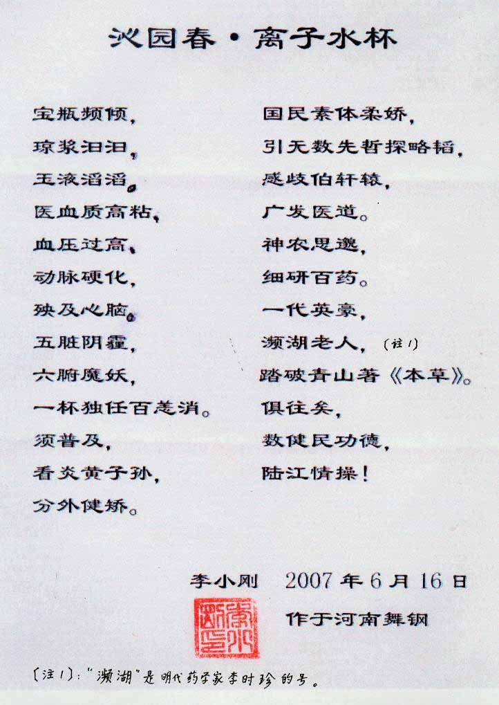 -----我是從事建筑的高工,本來沒有資格去攻克醫(yī)學(xué)難題,卻為了自身健康才扣響醫(yī)學(xué)的大門。由于我1990年患高血壓,因怕中風(fēng)才研究發(fā)明了離子水瓶,我把水處理成微小分子團(tuán)水,飲用后治愈了高血壓。便于1993年底送到三家省級(jí)醫(yī)院做臨床試用4個(gè)月。經(jīng)北京和廣西醫(yī)學(xué)專家鑒定:"降脂降壓效果好"," 能擴(kuò)大心腦動(dòng)脈流量,改善心腦電圖以及微循環(huán)","對(duì)治療心腦動(dòng)脈粥樣硬化、高血壓、高血脂有良好的醫(yī)療保健作用。""產(chǎn)品的技術(shù)性能和療效達(dá)到了同類產(chǎn)品的國(guó)內(nèi)領(lǐng)先水平,經(jīng)廣西醫(yī)學(xué)科學(xué)情報(bào)研究所檢索,未見國(guó)外有類似報(bào)道。"中國(guó)醫(yī)學(xué)科學(xué)院張正國(guó)教授從美國(guó)國(guó)立醫(yī)學(xué)圖書館數(shù)據(jù)庫(kù)存Medline檢索英俄文資料,均未見類似報(bào)告。2000年上市后,我為了對(duì)消費(fèi)者負(fù)責(zé)而繼續(xù)觀察研究,一直通過《信譽(yù)卡》和《質(zhì)量跟蹤調(diào)查書》向患者承諾療效,請(qǐng)用戶使用6個(gè)月后反饋效果。和脂壓患者飲用2至5個(gè)月內(nèi),消除癥狀,停服藥物,血壓正常;冠心病患者飲用3~5個(gè)月逐漸減輕至消除心絞痛、房顫等癥狀,不再服藥,飲用1年左右心電圖正常,經(jīng)冠脈造影掃描無明顯狹窄,表明冠心病痊愈。大量患者還反映許多衰弱器官被修復(fù),讓前列腺增生、慢性咽喉炎、慢性氣管炎、支氣管炎、慢性胃炎、腸炎和膽囊炎等不藥而愈;2型糖尿病患者是因?yàn)橐葝u衰弱致病,飲用該水半年至一年,逐漸減藥至停藥,血糖尿糖正常,真正治愈2型糖尿病。中風(fēng)后遺癥患者飲用六七個(gè)月,可逐漸減輕至消除肢體和語言障礙,表明飲用該水能讓壽命很長(zhǎng)的神經(jīng)元細(xì)胞逐漸修復(fù),奇跡般地恢復(fù)肢體和語言功能。飲用后還使胸腺和脾臟兩個(gè)重要的免疫器官被修復(fù)和增強(qiáng),產(chǎn)生免疫細(xì)胞多,提高了免疫力,使人不生病或少生病。自此, 飲用微小分子團(tuán)水創(chuàng)造了攻克冠心病、高(低)血壓和糖尿病三大醫(yī)學(xué)難題的奇跡。人們對(duì)此感到不可思議,但實(shí)踐是檢驗(yàn)真理的唯一標(biāo)準(zhǔn)。