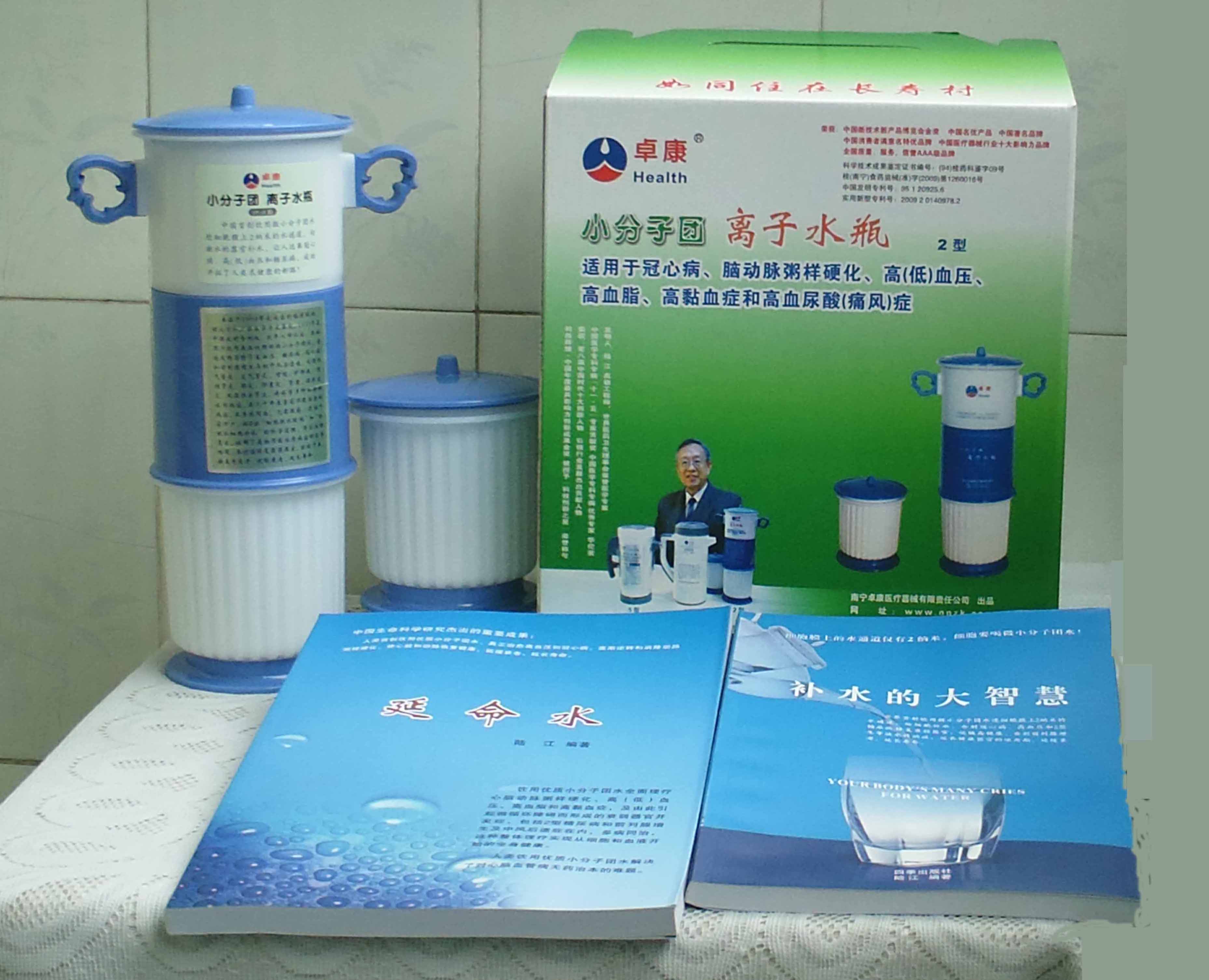 本品大量用戶的使用效果表明,能治愈冠心病、腦動(dòng)脈硬化、原發(fā)性高(低)血壓、高血脂、高粘血癥、高血尿酸癥(痛風(fēng))和2型糖尿病、衰弱器官并發(fā)癥(前列腺增生、腎衰與尿毒癥)及中風(fēng)后遺癥等療效好。產(chǎn)品配信譽(yù)卡。使用壽命30年,不換芯,易清洗。團(tuán)購(gòu)優(yōu)惠。從郵局匯款,匯費(fèi)1%,地址按本頁下方地址、聯(lián)系人寫。從銀行匯款,請(qǐng)點(diǎn)擊[聯(lián)系匯款]欄,從工商銀行匯款,建設(shè)銀行、農(nóng)業(yè)銀行匯款,均免收匯費(fèi),匯款后20--30分鐘內(nèi)發(fā)短信,可用微信轉(zhuǎn)帳,均免匯費(fèi),微信號(hào)即手機(jī)號(hào)13768308380。匯款后,告知你的姓名和地址,我公司聯(lián)系人手機(jī)號(hào)是:13768308380。卓康牌離子水瓶為我公司獨(dú)家生產(chǎn),郵購(gòu)產(chǎn)品配《補(bǔ)水的大智慧》彩印書一本,另配四季出版社出版的新書《補(bǔ)水的大智慧》一本,并配光盤一張(含央視主持人釆訪陸江的對(duì)話視頻)。目前市場(chǎng)和"淘寶網(wǎng)"上有人兜售假冒的偽品,望讀者審察辯別真?zhèn)危旒僬哓飧`假冒本公司的各種認(rèn)證、獲獎(jiǎng)獎(jiǎng)項(xiàng)、專利號(hào)和外包裝盒上的中英文字,包括科技成果的鑒定意見等,請(qǐng)讀者注意防偽。如何識(shí)別假貨?已經(jīng)買了假貨怎么辦?(請(qǐng)點(diǎn)擊[打假掠影][打假掠影])。