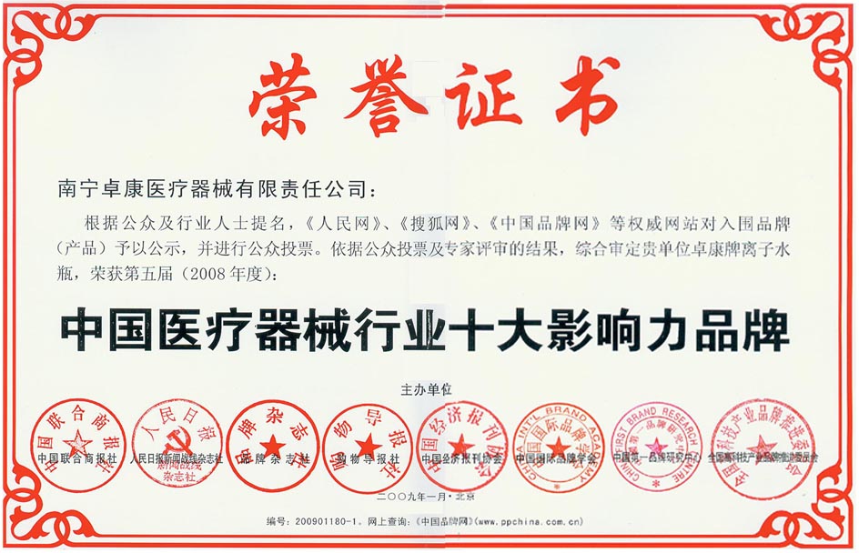 卓康牌離子水瓶榮獲中國(guó)名特優(yōu)品牌[點(diǎn)小圖見大圖] *榮獲中國(guó)醫(yī)療器械行業(yè)十大影響力品牌[點(diǎn)小圖見大圖]--------