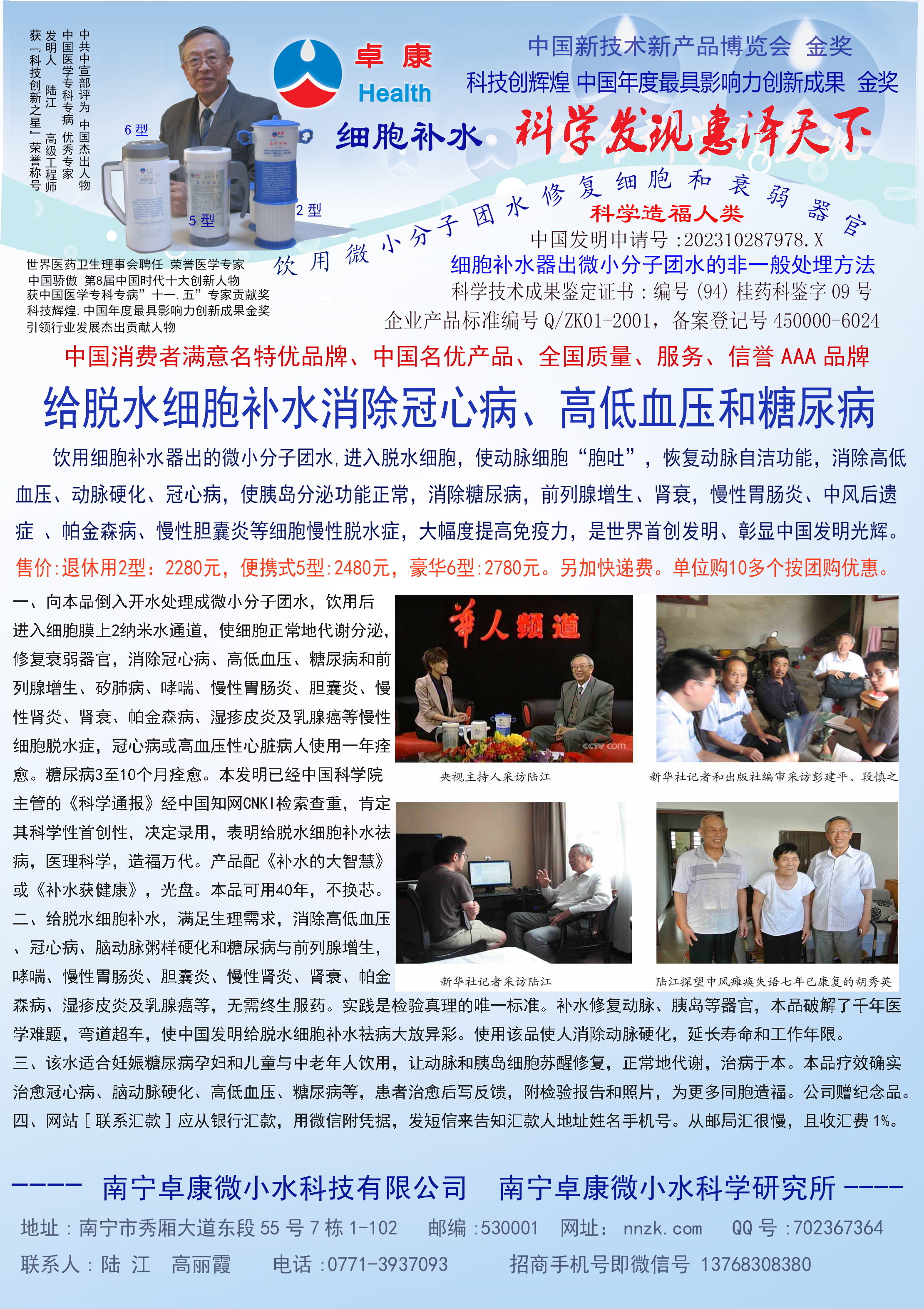 - -- 幾千年來,人類靠醫(yī)藥不能根治冠心病、高血壓和糖尿病,如想根治,那是夢(mèng)想。可是,我從中國(guó)基礎(chǔ)醫(yī)學(xué)研究成果受到啟發(fā),研發(fā)了一種發(fā)明產(chǎn)品,處理出微小分子團(tuán)水讓人飲用,實(shí)現(xiàn)了人類這一夢(mèng)想!患者飲用后遠(yuǎn)離了冠心病、高血壓和2型糖尿病。這一成果曾經(jīng)過臨床試用和專家鑒定,作為準(zhǔn)字號(hào)醫(yī)療器械讓廣大患者飲用,療效進(jìn)行跟蹤調(diào)查。很多患者的反饋情況令人感動(dòng),我放在公司網(wǎng)站上(nnzk.com),震撼了醫(yī)學(xué)專家,也使廣大同胞受到啟發(fā)。人們盼望飲用它給細(xì)胞補(bǔ)水,治愈多種病癥,既省錢,又安全,而且延長(zhǎng)壽命。